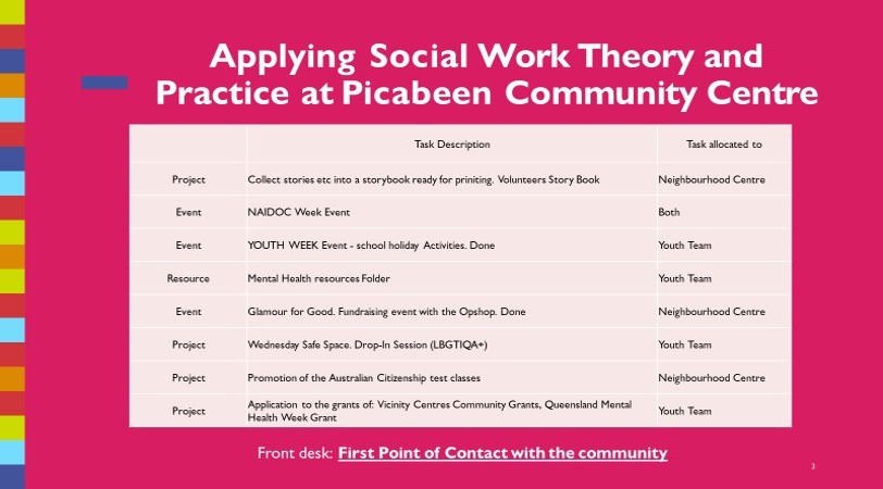 “This is my first placement for my Bachelor of Social Work at QUT. I’m blessed. This placement allows me to contribute to my communities. Picabeen is a great community centre the best know in Brisbane city. The inclusiveness and richness of support given by the staff and volunteer in the organisations make me feel supported. The project that I am working on is about Opportunities for change in the disability area. We are working on a project named Opportunities for Change. This project aims to promote inclusion at Picabeen. Our goal is to support people with a disability to volunteer and/or participate in activities and services at Picabeen and The Change Room (Op-shop).